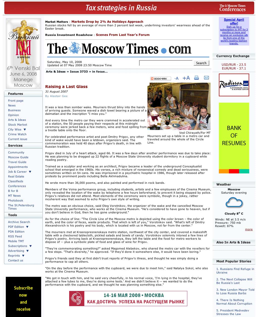 “Raising a Last Glass. The life of artist and poet Dmitry Prigov was celebrated in the metro last week, as fellow artists held a wake as unconventional as the man himself.” Aug. 31, 2007